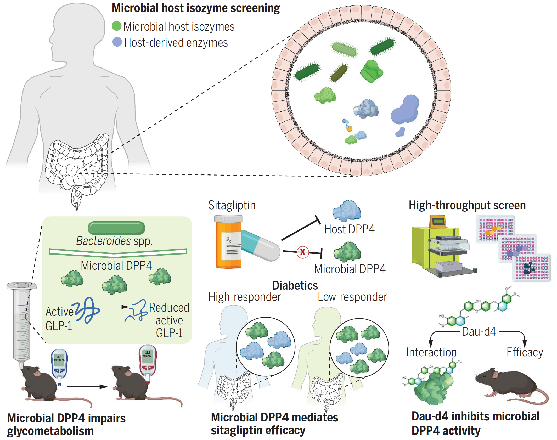 生命科学联合中心乔杰教授、雷晓光教授团队与合作者北大医学部基础医学院/北京大学第三医院医学创新研究院姜长涛教授团队、美国国立卫生研究院Frank Gonzalez团队以及首都医科大学朝阳医院王广团队合作,于2023年8月4日在Science杂志在线发表了题为Microbial-host-isozyme analyses reveal microbial DPP4 as a potential antidiabetic target的研究论文,首次提出了肠道菌源宿主同工酶(Microbial-host-isozyme,MHI)新概念,发现菌源宿主同工酶在肠道中的广泛存在,可以模拟宿主酶的功能,并参与疾病的发生发展。其中,菌源DPP4是一种重要的同工酶,可以在肠屏障损伤条件下进入肠组织,降解宿主活性GLP-1,诱导糖耐量异常。宿主DPP4抑制剂西格列汀无法有效抑制菌源DPP4活性,是西格列汀临床治疗响应性个体差异大的重要原因。进一步,通过高通量药物筛选以及深入的功能验证,研究团队发现了首个对菌源DPP4具有高活性和强选择性的小分子抑制剂Daurisoline-d4,可以通过特异性抑制菌源DPP4,改善糖耐量异常。