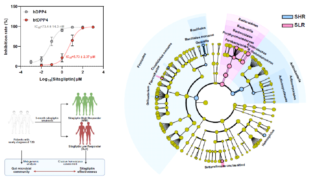 DPP4抑制剂西格列汀在临床上广泛用于2型糖尿病的治疗,是2021年全球销量第二的抗糖尿病小分子药物。然而,西格列汀的治疗效果具有较大的个体差异,临床研究发现,西格列汀对约40%的患者无法发挥有效降糖作用,其机理尚未阐明。菌源DPP4是否有可能在其中发挥了一定作用?利用酶活抑制实验及西格列汀与菌源DPP4的共结晶分析,研究人员发现目前西格列汀等针对人DPP4开发的治疗药物对菌源DPP4的抑制作用较弱。研究人员进一步招募了57名初诊2型糖尿病患者进行了为期3个月的西格列汀干预研究,与此前报道一致,不同患者对西格列汀干预的疗效具有较大的个体差异。基于多组学关联分析、菌群移植、噬菌体靶向干预实验,研究人员发现多形拟杆菌产生的btDPP4介导了西格列汀的临床响应性,为西格列汀临床响应性个体差异的提供了分子机理与作用靶点。