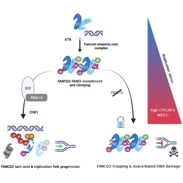 当复制叉停止时,FANCD2-FANCI (ID2)二聚体被招募到染色质上,夹住DNA,发生单泛素化。虽然二聚体夹住DNA是独立于FANCD2单泛素化发生,但这种修饰稳定了箝位构象,保护复制叉。一旦条件允许复制叉恢复,需要去泛素以重新打开复制叉——然而USP1-UAF1复合物(USP-1:去泛素化酶泛素特异性蛋白酶1;UAF1:USP1相关因子1 )并不能让Ub-FANCD2-Ub-FANCI二聚体去泛素化。卡罗林斯卡学院的研究人员发现,是CHK1对关键通路蛋白FANCD2的磷酸化触发其FBXL12依赖性蛋白酶体降解,促进FANCD2在停滞的复制叉处的清除,这种机制对于复制恢复和细胞存活至关重要。这促进了在CYCLIN E和药物诱导的复制应激条件下有效的DNA复制。用磷酸化蛋白突变体构建的FANCD2缺陷成纤维细胞无法恢复复制叉进程。在缺乏FBXL12的情况下,FANCD2被困在染色质上,导致复制应激和过度的DNA损伤。