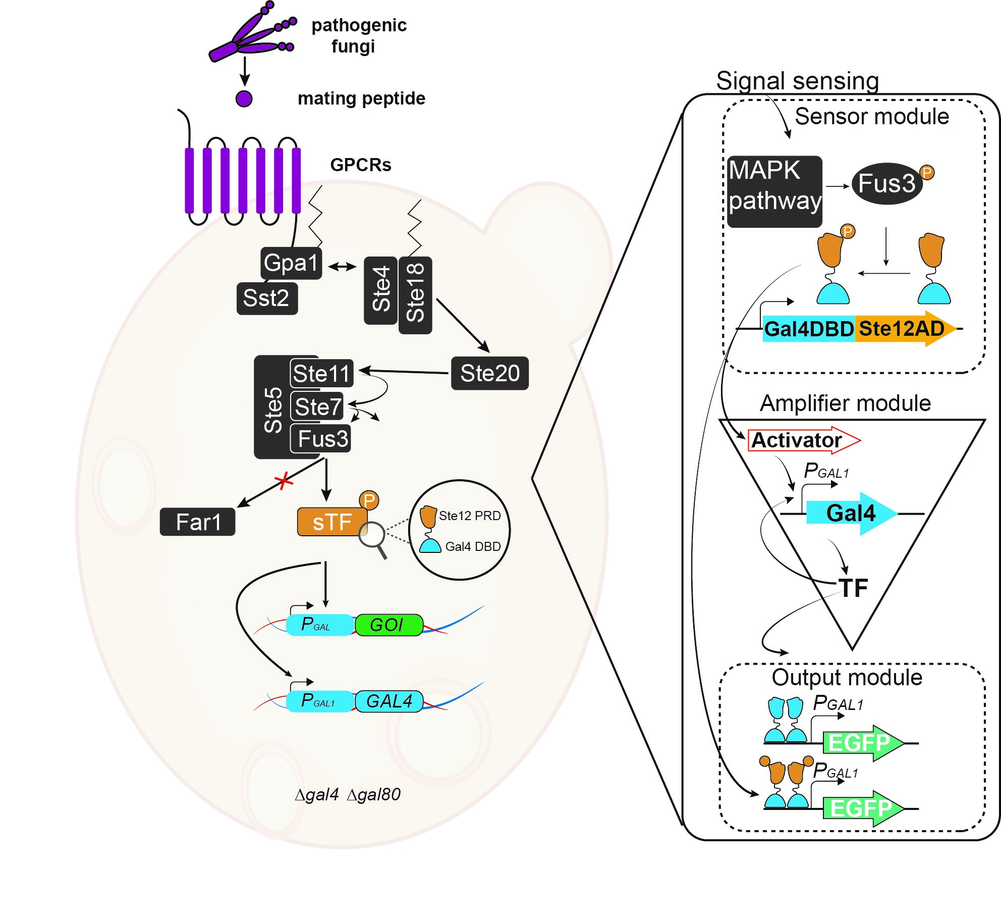 首先,GPCR信号机制本质上是可模块化的,研究人员基于前期工作半乳糖调节 (GAL) 系统通过人工转录因子与信息素感知的 GPCR 信号通路耦合,重塑了MAPK控制的转录因子,将输出模块重定位为半乳糖系统。通过使用来自病原真菌白色念珠菌的异源GPCR取代酵母天然Ste2受体调整GPCR蛋白的输入模块,重构的酵母生物传感器可感知来自病原真菌的外来信息素并触发信号转导以诱导GAL系统下报告基因的表达(图1)。