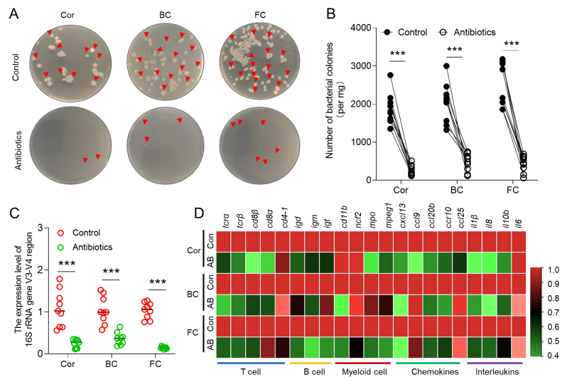为了进一步评估黏膜表面的微生物群是否有助于其免疫环境的形成,通过抗生素消除微生物后,与免疫相关的基因表达水平显著降低(图2),这表明黏膜处微生物参与塑造局部免疫微环境。