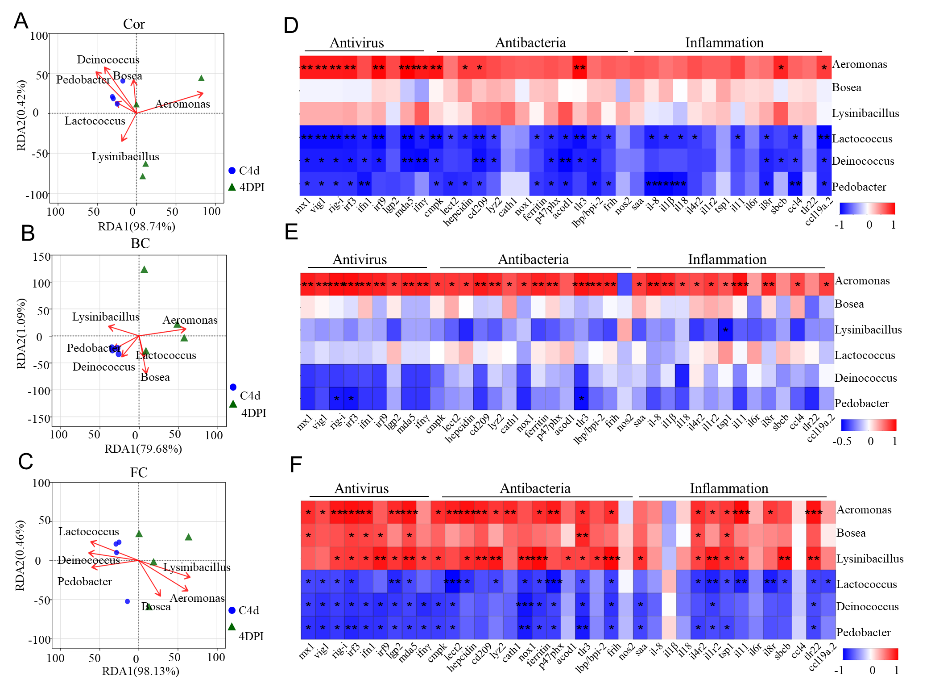 重要的是,在病毒感染后,黏膜变化的微生物群和免疫相关基因表达显著相关(图3)。暗示病原菌很大程度上促进抗菌和炎症基因的表达,而有益细菌则起相反的作用。此外,伴随着后期组织损伤和微生物移位的逆转,以及微生物群稳态的恢复,炎症反应也随之消失。以上结果表明硬骨鱼类黏膜免疫与微生物之间相互塑造,共同维持宿主的黏膜稳态平衡。