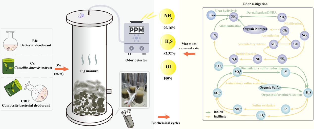 上述研究结果以“Efficacy of composite bacterial deodorant constructed with Camellia sinensis and its in-situ deodorization mechanism on pig manure”为题,发表在二区TOP期刊Waste Management上(IF=7.1)。论文第一作者为2023级博士研究生王茄灵,通讯作者为闫志英研究员。本研究得到了四川省科技计划项目(2021ZDZX0012,2022JDTD0027,2023ZHCG0056)、国家自然科学基金(32271531)的支持。