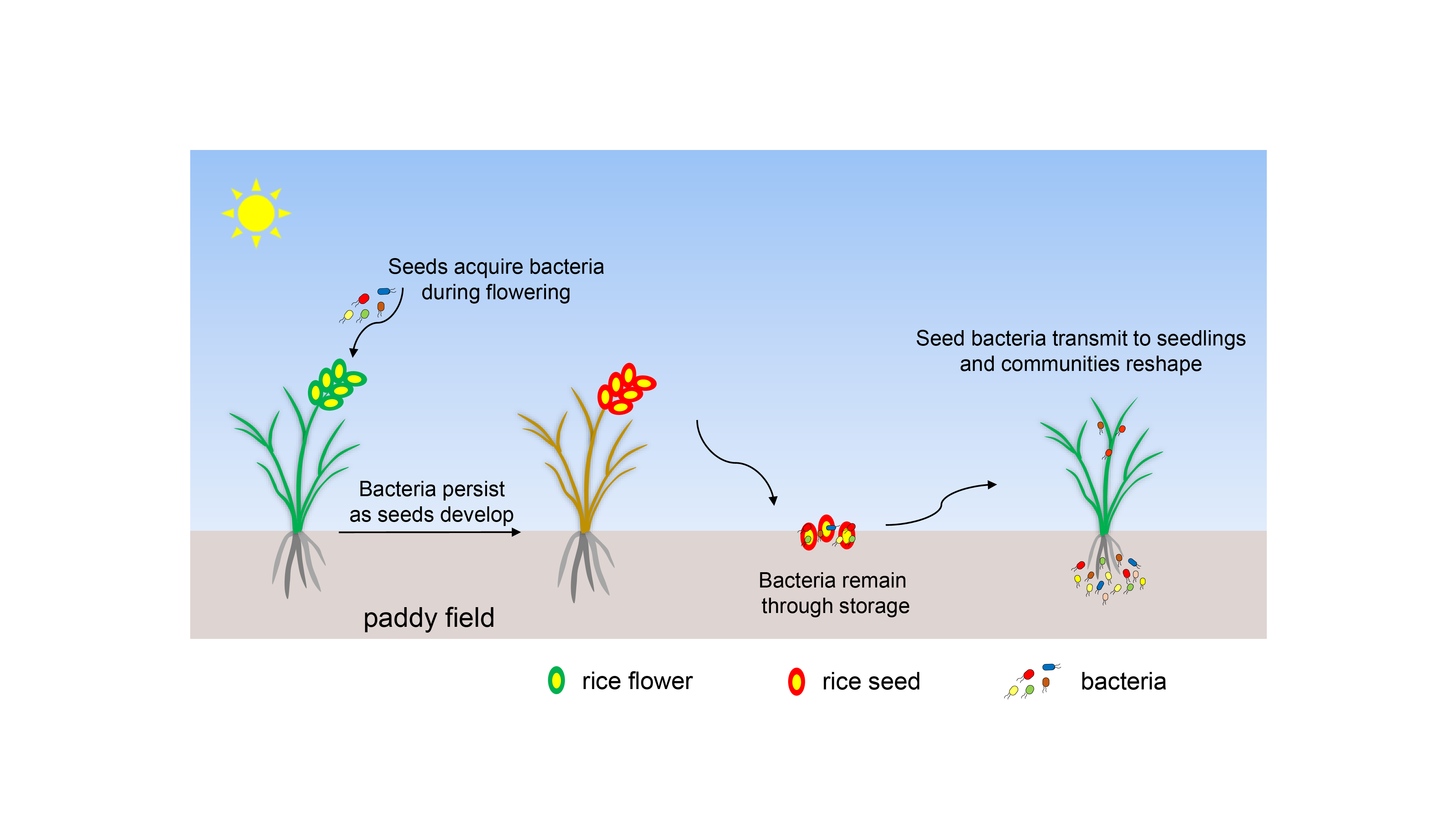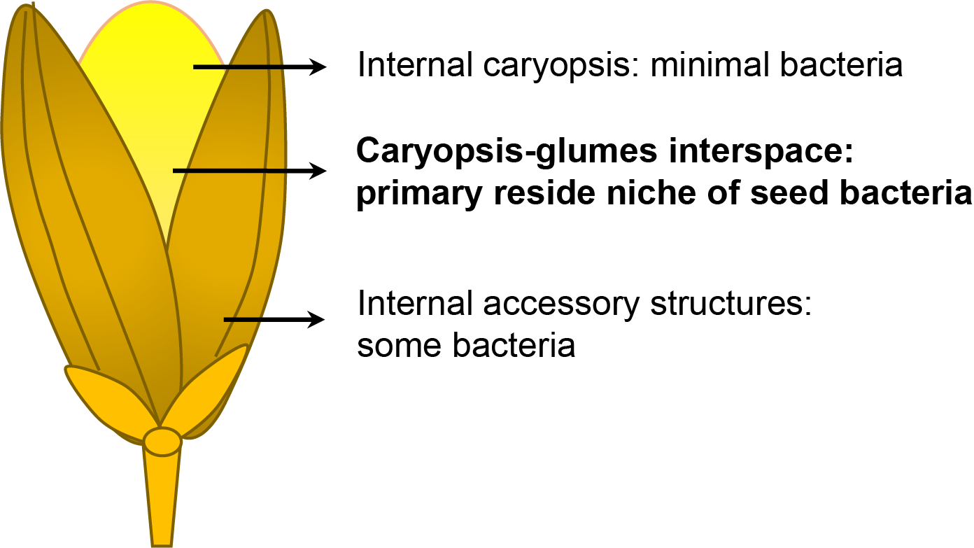 研究发现,水稻种子具有丰富的内生菌群,这些微生物主要定殖于颖果(遗传学意义上的种子)和种子附属结构之间,而颖果本身保持基本无菌的状态。种子菌群主要在开花期从环境中获得,灌浆期和黄熟期则不具备获得外源菌群的能力。菌群一旦获得,能在种子发育和贮存期间维持稳定数量,并能随种子萌发迁移至新生植株的叶片和根系,同时根据不同组织特征进行群落重构。