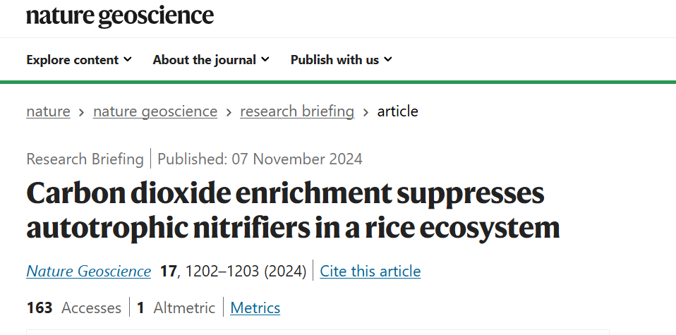 2024年11月7日,Nature Geoscience期刊在Research Briefing栏目发表了题为“Carbon dioxide enrichment suppresses autotrophic nitrifiers in a rice ecosystem”的研究简报,积极评价了浙江大学生命科学学院程磊教授团队同期发表的题为“Inhibition of autotrophic nitrifiers in a nitrogen-rich paddy soil by elevated CO2” 的研究论文 (www.nature.com/articles/s41561-024-01583-2)。研究简报与论文于2024年12月6日同期正式发表于Nature Geoscience(volume 17,issue 12)。