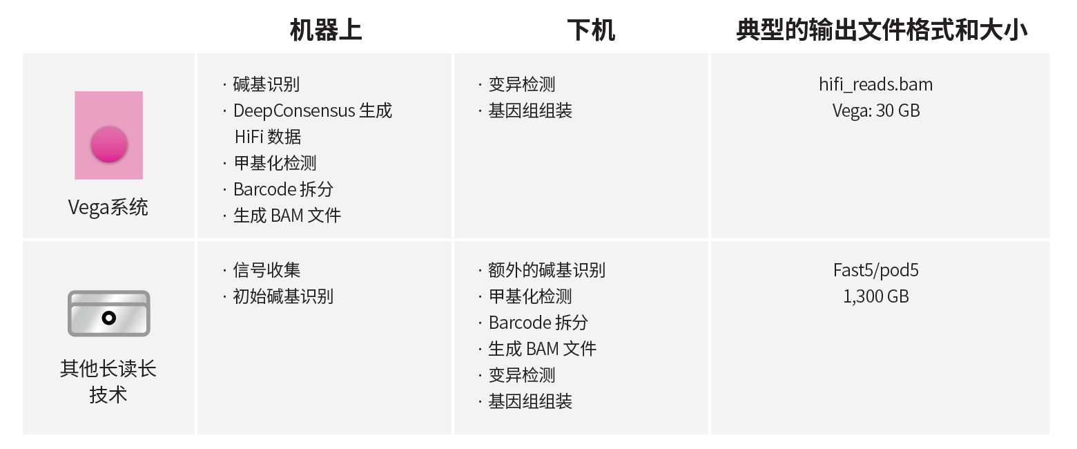Vega系统不仅能够检测碱基,每次运行还会使用深度学习算法测量DNA甲基化状态。仪器上的初级分析包括多重样本条码拆分和转换为标准BAM格式—因此您可以更快地获得有意义的见解。高效的数据表示以大约0.5位/碱基对序列、质量值和甲基化进行编码 — 测序文件比其他长读长测序小20倍。
