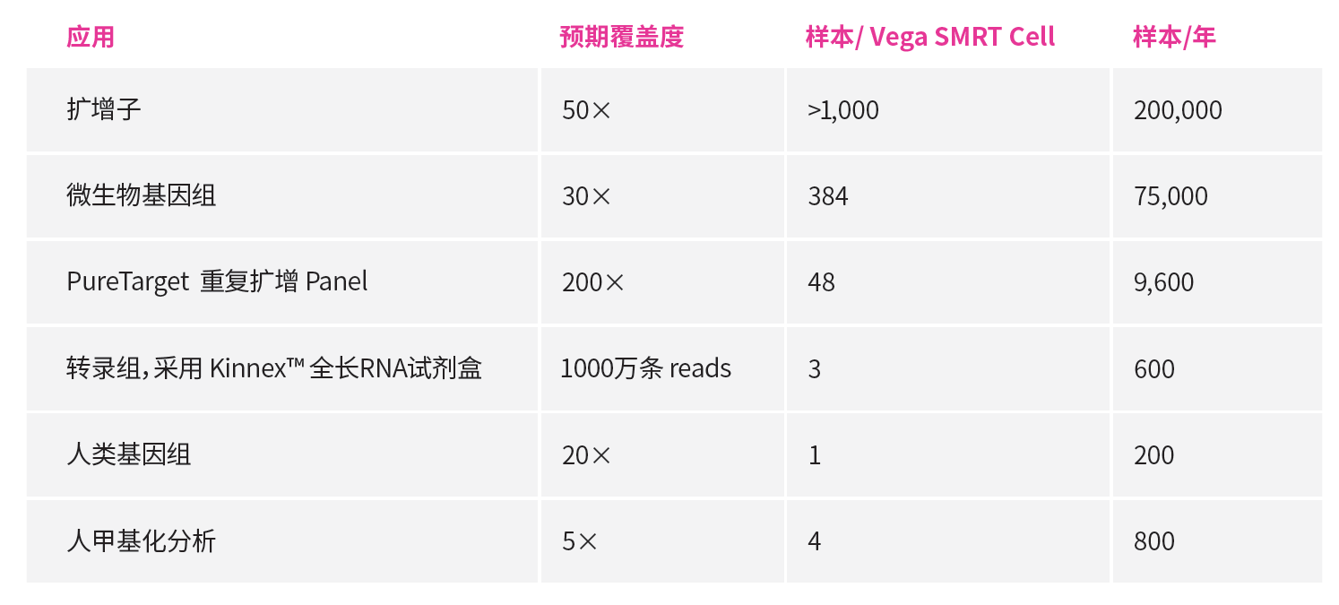 一次运行一张Vega SMRT Cell产生60G数据,可实现的应用及样本通量如下: