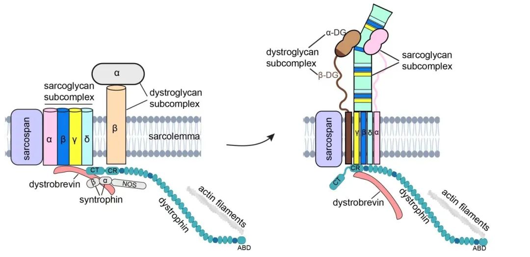 如果说,肌肉细胞是一栋高楼大厦,那么DGC复合体既是大厦的“减震器”,也是“通讯设备”。当肌肉收缩时,会产生巨大的机械力,DGC复合体在细胞外侧与细胞外基质相互作用,在细胞内侧通过肌营养不良蛋白与细胞骨架连接,是连接细胞内外的纽带,就像一个高效的减震器,可以吸收和分散这些机械力,进而帮助保护和维持肌肉细胞膜的完整性和稳定性。同时,DGC复合体也具备信号传导的作用,影响细胞的生长、分化和存活。