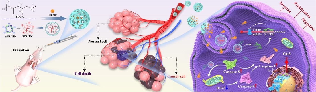 同时,miR-23b除具有抗炎功能外,其能够抑制细胞增殖,在肿瘤基因治疗研究中具有广阔的前景。研究团队针对肺癌传统治疗手段靶向性差及副作用大等缺陷,构建了以PLGA为基质的多孔微球体系,该体系实现了淫羊藿苷与miR-23b的担载,基于吸入式策略实现了药物与治疗基因在肺部的靶向沉积和持续释放,有效诱导肺癌细胞凋亡并抑制肿瘤转移,为肺癌的药物与基因联合治疗提供了一条局部给药新策略。相关研究“Porous PLGA microspheres for the inhalation delivery of icariin and miR-23b in the treatment of metastatic lung cancer”发表于国际学术期刊Asian Journal of Pharmaceutical Sciences(1区,影响因子10.7)。论文第一完成单位为吉林大学生命科学学院,博士生熊博宇为该论文的第一作者,李全顺教授、韩浩博副教授为该论文的共同通讯作者。