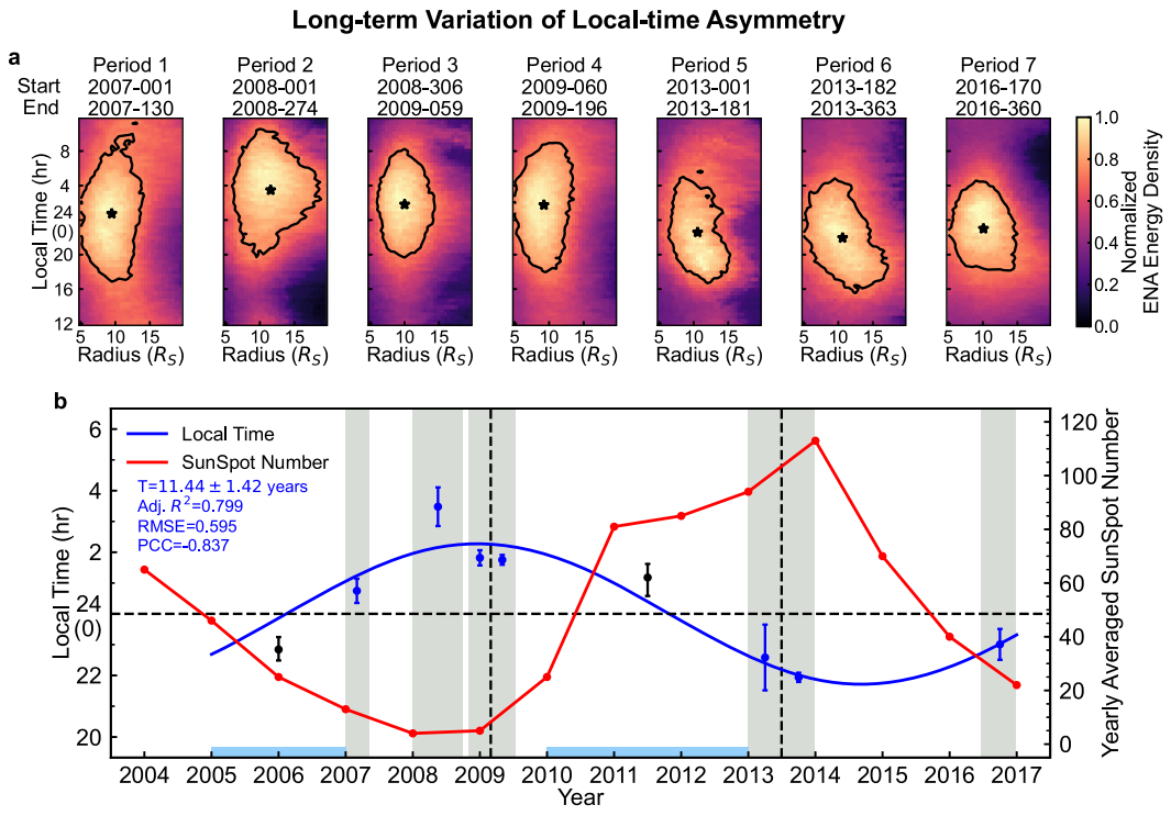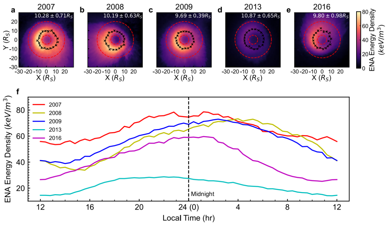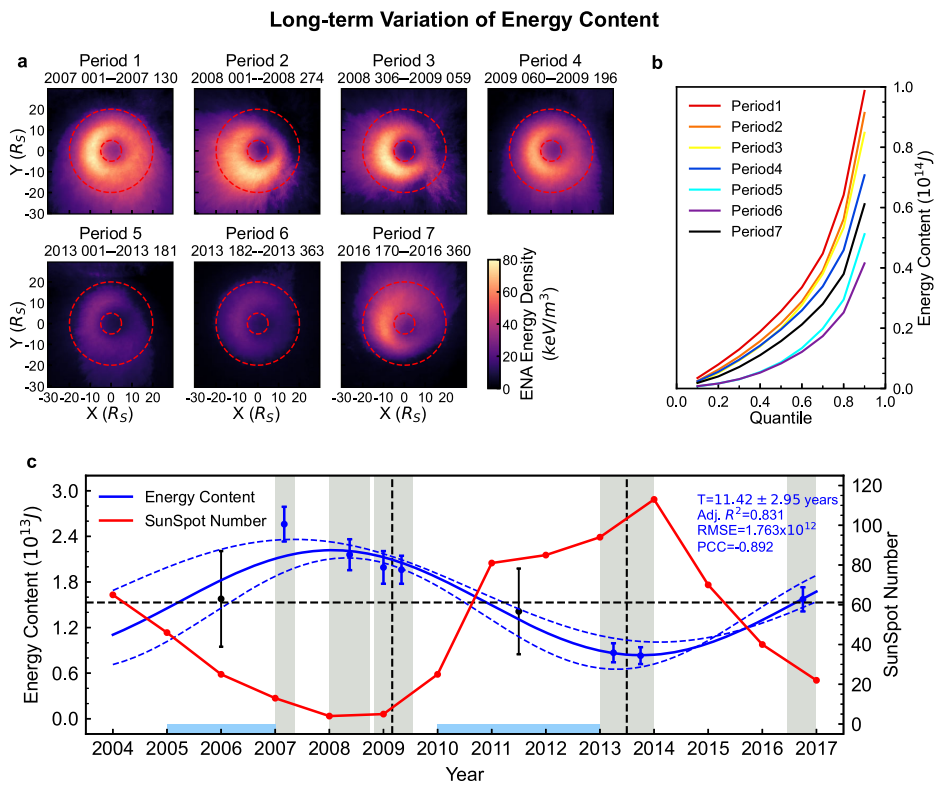 北京大学地球与空间科学学院乐超研究员课题组利用土星探测卫星卡西尼号(Cassini)上搭载的能量中性原子成像仪研究了土星环电流的长期分布特征,发现由超热等离子体(~24-230keV)贡献的环电流成分在空间分布和强度上存在近11年的长周期变化,并将这种变化与太阳活动周期相关联,提出太阳活动周期调制土星磁层中等离子体加速与输运过程的可能性。相关成果于近期发表于学术期刊《自然·通讯》(Nature Communications)。
