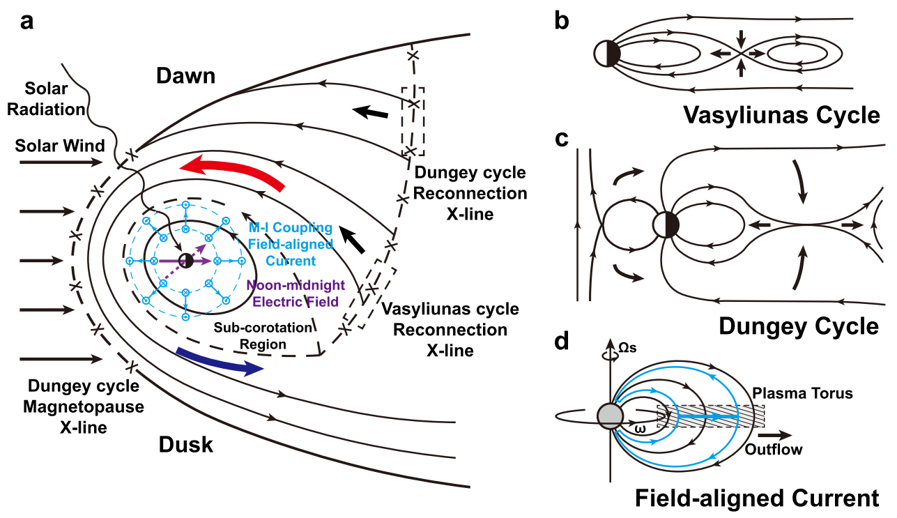研究结果表明,太阳活动可能调制土星磁层等离子体加速与输运过程。一方面太阳风压缩土星磁层,日侧磁层顶与行星际磁场重联引起的磁尾重联和等离子体注入(Dungey cycle),与土星自转驱动的磁尾重联和等离子体注入(Vasyliunas cycle)过程相互作用,可能引起环电流地方时分布不对称性的变化;另一方面太阳辐射可以影响土星电离层电导率,并通过共转驱动的场向电流影响磁层中的磁通量管交换过程,从而调制环电流超热等离子体的加热(图4)。此外,类似的长周期变化也存在于土星辐射带和正午-午夜场中,说明太阳活动的调制可能更广泛地存在于土星磁层中。本研究为太阳活动调制气态巨行星磁层提供了新的视角,并期待能通过未来的木星探测卫星(JUICE)搭载的ENA成像仪展开更进一步的研究。