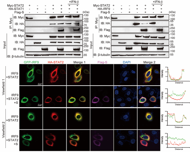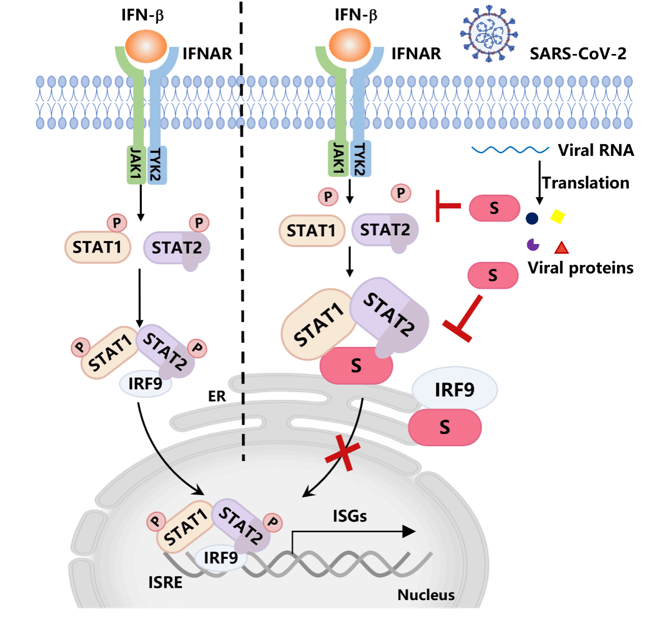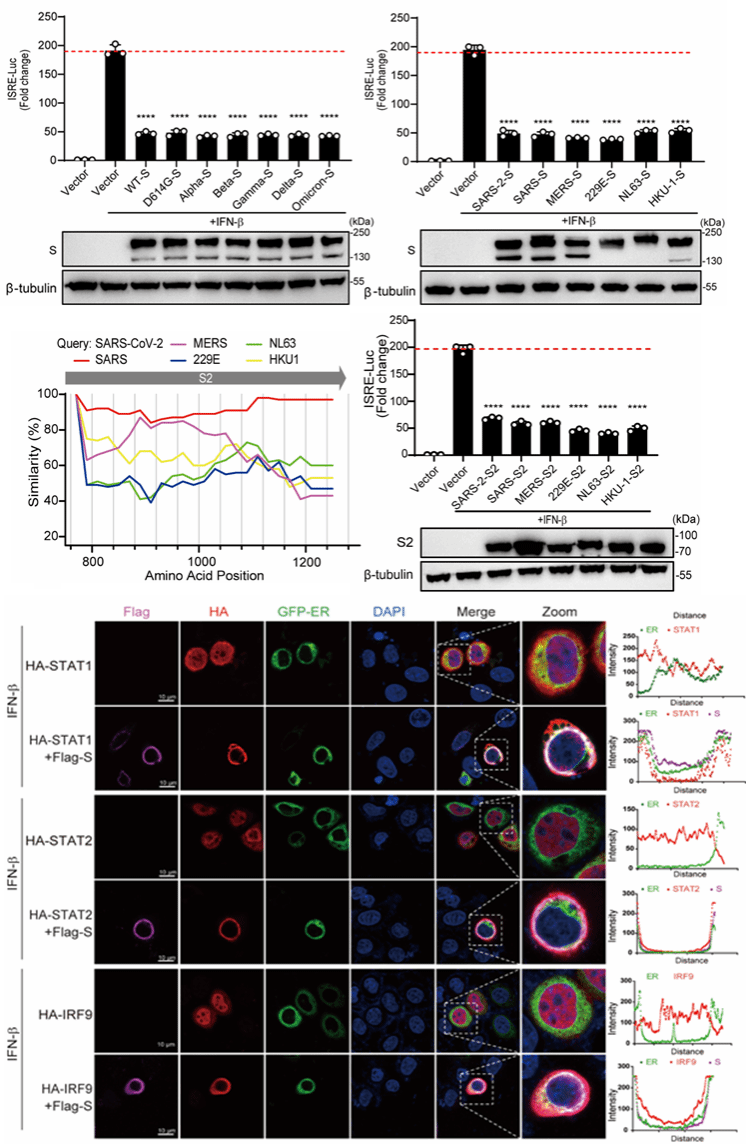 图1. 冠状病毒S蛋白抑制I型干扰素下游信号通路的共性策略