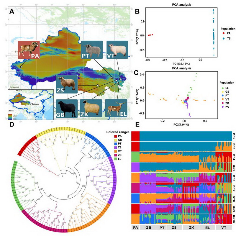 藏羊(Tibetan sheep)是青藏高原地区重要经济动物,因其耐寒冷、耐低氧和抗病力强等高原适应特性,为高原地区农牧业经济发展提供了重要支持。经过长期的环境适应和人工选择,藏羊在青藏高原独特的自然条件下已经驯化出十多个品种,其中青海省内的主要品种包括高原型藏羊、山谷型藏羊、欧拉型藏羊、贵南黑裘皮羊、扎什加羊和泽库羊。然而,到目前关于藏羊的遗传多样性与驯化机制的研究还不够深入。?