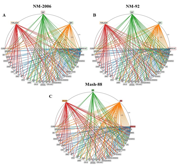 结果表明,镉对植物叶绿素含量、根系和茎长等关键生长参数有严重影响,且会通过提高过氧化氢和作为胞损伤关键标志物的丙二醛水平来诱导氧化应激。水杨酸通过增强绿豆品种的抗氧化防御机制,显著降低镉的有害影响。水杨酸的施用提高抗氧化酶的活性,调节植物激素反应,减少氧化应激,进而改善植物的整体健康。其中,Mash-88对镉胁迫的抗逆性最强,NM-92对水杨酸胁迫的响应最明显。