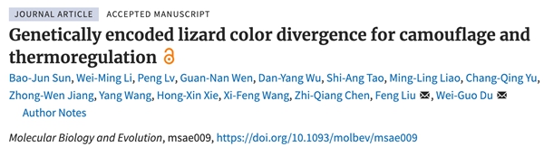 动物体色的本地适应(Local Adaptation)在物种形成和适应性进化过程中至关重要,然而关于其本地适应的近因(生理生化)和远因(进化)的全面研究仍然十分缺乏。近日,中国科学院动物研究所杜卫国团队和刘峰团队联合攻关,以青藏高原分布的贵德沙蜥物种为研究系统,整合室内外生态实验、基因组测序和遗传验证等手段,揭示了贵德沙蜥体色本地适应的驱动力及生理生化和分子机制。相关成果以Genetically encoded lizard color divergence for camouflage and thermoregulation为题,于2024年1月19日在线发表在进化生物学知名期刊Molecular Biology and Evolution上。