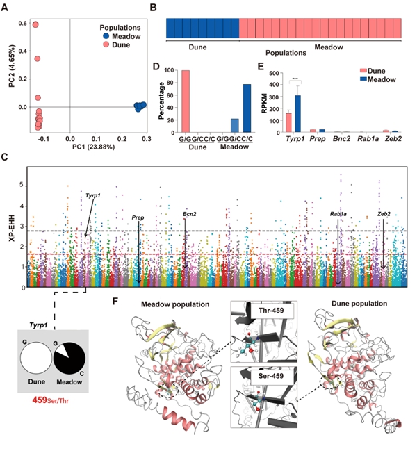 生理生化分析显示,这种体表的反射率所反映的体色差异,是由于体表的黑色素含量差异造成的。通过深色种群和浅色种群的基因组重测序分析,研究人员在深色蜥蜴种群的黑色素生成相关基因Tyrp1的459#位点发现了一个新的GC突变,是造成体色分化的遗传基础。结果显示该位点的等位基因频率在深色蜥蜴中为22.22% G/C和77.78% C/C,在浅色蜥蜴中为100% G/G。通过模型预测TYRP1的酶三级结构和催化活性,表明该突变增加了TYRP1酶结构的灵活性和催化活性,从而促进了深色蜥蜴体表黑色素的生成(图1)。
