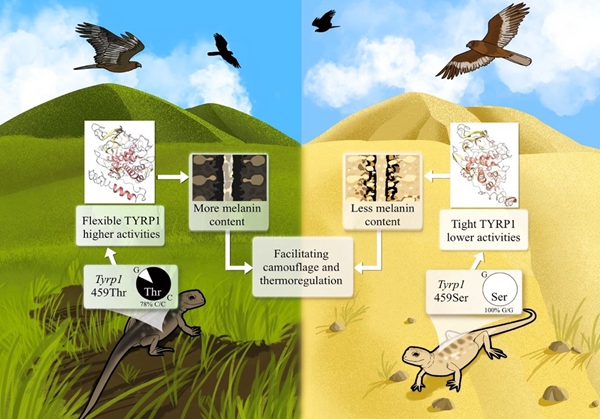 简言之,本研究通过系统的实验研究和数据分析,发现一个来自黑色素生成关键基因的新突变构成了贵德沙蜥体表颜色变异的遗传基础,保护色和体温调节对体色的共同选择可能会加强适应性遗传分化的发生,使具有不同体色的相邻种群得以存续。