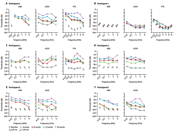 图 RRG-003基因治疗前后的受试者听力 在国家自然科学基金项目(批准号:82225014、82192864、82171148)等资助下,复旦大学附属眼耳鼻喉科医院舒易来教授、李华伟教授牵头开展全球首个先天性耳聋基因治疗的临床试验并取得进展,研究成果以“AAV1-hOTOF基因治疗常染色体隐性遗传性耳聋9:一项单臂研究( AAV1-hOTOF Gene Therapy for Autosomal Recessive Deafness 9: a single-arm trial)”为题于2024年1月25日发表于《柳叶刀》(The Lancet)杂志,论文链接:https://doi.org/10.1016/S0140-6736(23)02874-X
