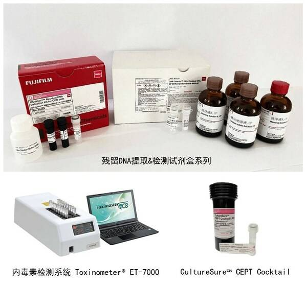 富士胶片和光的展品中,残留DNA提取试剂盒遵循中国药典收录的碘化钠法,可兼容qPCR下游检测,操作简单、安全性高、回收率高,搭配QCdetect™系列残留DNA检测试剂盒可进行高灵敏度、高再现性残留DNA检测;内毒素检测仪Toxinometer® ET-7000符合美国/欧洲/日本药典的"细菌内毒素检查法",搭配Wako的动态浊度法、动态显色法鲎试剂可进行高灵敏度、特异性内毒素检测;除生物制药质量控制产品外,本次也出展了支持iPSC上下游产线的小分子混合物CultureSure™ CEPT Cocktail,不仅能够有效提高细胞传代和冻存时hPSCs的存活率[1],并且还能促进胚状体、类器官的形成[1,2]。