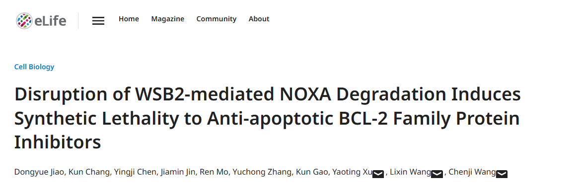 2024 年 8 月 8 日,复旦大学生命科学学院 王陈继 团队、复旦大学附属中山医院 王利新 团队和同济大学附属第四人民医院 徐耀庭 团队合作在 eLife 在线发表了题为 Disruption of WSB2-mediated NOXA Degradation Induces Synthetic Lethality to Anti-apoptotic BCL-2 Family Protein Inhibitors 的研究论文(图一)