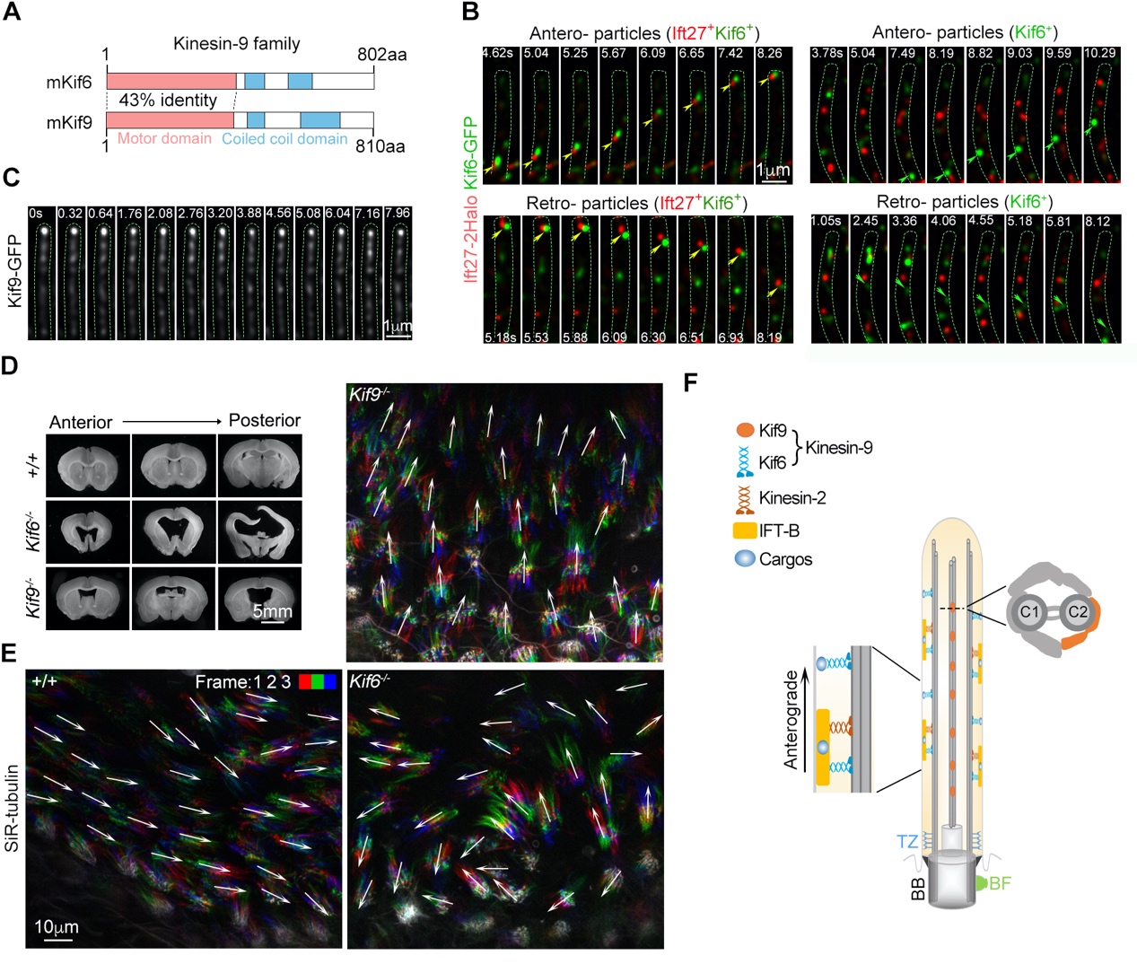 (A)鼠源Kif6和Kif9的示意图;(B)Kif6-GFP能在脑室运动纤毛外周微管上进行长距离的双向运动,有些与Ift27颗粒共运动(Ift27+Kif6+),有些则单独运动(Kif6+);(C)Kif9-GFP在中央器上进行短距离的晃动;(D)大脑切片观察脑室扩大情况显示Kif6敲除(Kif6-/-)小鼠出现严重的脑积水,而Kif9敲除(Kif9-/-)小鼠仅表现为轻微的脑积水;(E)与野生型(+/+)和Kif9敲除小鼠不同,Kif6敲除小鼠的脑室管膜上皮运动纤毛摆动方向紊乱;(F)Kif6和Kif9在运动纤毛的功能模式图。