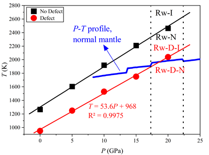 针对不含缺陷林伍德石的计算结果表明,林伍德石的能量随着离子位置交换的发生先增大后减小,正林伍德石和反林伍德石(一半Mg (Fe)离子占据四面体位置、另一半Mg (Fe)和Si离子占据八面体位置的能量较低,而其它无序状态的林伍德石的能量较高。另外,林伍德石中离子位置交换是一个熵增加过程,熵的变化也会对正-反林伍德石的相变产生影响。综合考虑这些因素,赵旭炜发现,不含缺陷反林伍德石的稳定温度非常高:在地幔过渡带压力条件下,超过2400K。由于地幔过渡带温度约为2000K,不含缺陷反林伍德石因此很难在地幔过渡带稳定存在(图3)。