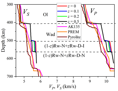 为探讨正-反林伍德石相变对地幔波速结构的影响,赵旭炜对含缺陷及不含缺陷的正、反林伍德石的弹性性质进行了计算,发现:正、反林伍德石的波速差异主要受正、反林伍德石结构差异的控制,与缺陷种类及其浓度关系不明显(图5);在20GPa下,正、反林伍德石的P波和S波差异分别约为6%和11%,这种差异的存在足以导致可观测的地震波不连续面;当存在缺陷时,地幔橄榄石的高压相变序列变为橄榄石-瓦兹利石-反林伍德石-正林伍德石,相变深度分别对应410km、520km和560km地震波不连续面(图6)。