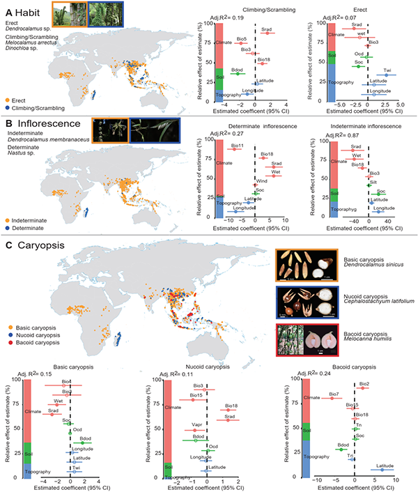 中国科学院昆明植物研究所李德铢团队在扩大取样的基础上,基于优化的简化基因组测序(MiddRAD-seq)技术,利用大量SNPs数据重建了PWB分支基于32属180个代表种(含外类群5个属的5个代表种)共208个个体取样的系统发育框架和时空演化历史,并探索了习性、花序类型和颖果类型与气候、土壤和地形等41个环境因子的关系。研究发现,PWB冠群在渐新世-中新世之交开始分化,先后形成了Melocanninae、Racemobambosinae s.l.(包括Dinochloinae,Greslanlinae,Racemobambosinae s.str.和Temburongiinae)、Hickeliinae以及Bambusinae?s.l.?(包含Bambusinae s.str.和Holttumochloinae)四个主要分支(亚族)(图1、2),其祖先具有直立的习性、续次性发生花序和基础型颖果类型,且在PWB多样化的过程中,攀缘习性、一次性发生花序、坚果型/梨果型颖果等性状经历了多次演变(图2)。这三种性状的演变都与气候、地形和土壤具有一定的相关性(图3),因此,PWB分支形态性状的演化可能受到气候、地形和土壤多因素的影响。总体来看,三个形态性状的演化与气候因子的相关性最强,其次是地形因子,与土壤因子的相关性最弱。相对而言,直立生活习性以及梨果状颖果的演化受地形因子的影响较为明显,坚果状颖果演化则主要受气候因子的影响,与土壤因子和地形因子之间的相关性非常弱。该研究还分析了影响每种形态性状演化的关键环境因子以及两者之间的关系,并预测了可能有助于不同形态性状演化的生态位特征,例如:年平均太阳辐射(Srad)\最暖季降水量(Bio18)\年平均湿润频率(Wet)与一次性发生花序的演化呈正相关,而与续次性发生花序的演化呈负相关,表明花序类型的演化可能与生态位的湿度更相关,且续次性发生花序所在生态位的土壤有机碳含量(Soc)偏高等。该研究结果首次利用大量核基因数据解析了PWB分支的系统发育框架和时空演化历史,并从多环境因子的角度探讨了形态性状的适应性演化,为深入理解整个竹亚科起源、演化以及环境适应性有重要理论价值,也为今后竹亚科乃至禾本科的生态学和进化研究提供了新的视角。
