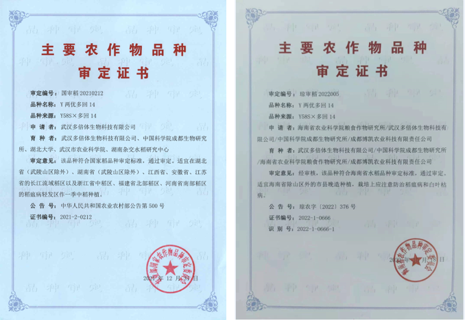 尽管四倍体水稻在杂交优势利用系统与材料开发方面取得了很好的进展,但至今还没有直接利用四倍体水稻育成的商业化品种。多倍体水稻及其回复二倍体表型变异丰富,杂种优势明显,具有巨大的育种价值。近期,中国科学院成都生物研究所农业品种与技术国际合作创新团队水稻研究组与武汉多倍体生物科技有限公司、湖北大学等单位合作,在海天二倍体(HT2)人工加倍染色体培育出海天四倍体(HT4)(参考文献:栾丽,龙文波,王兴,陈英,邱琳,涂升斌等.(2009).秋水仙素诱导水稻幼穗愈伤组织创制同源四倍体种质的研究.四川大学学报:自然科学,46(3),829-837)和利用HT4自交回复突变后代培育优良回复二倍体(HTRM2)的基础上,利用自交回复二倍体与Y58S两系不育系组配出优良两系杂交水稻新品种—Y两优多回14(HTRM12),该新品种近期通过国家品种审定和海南省品种审定,这为四倍体水稻育种利用提供了一条新途径。