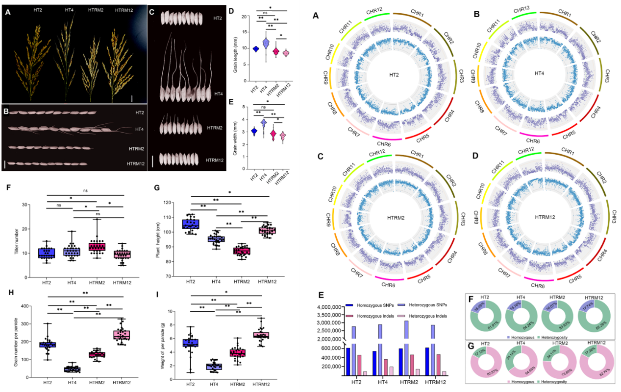 图3 HT2、HT4、HTRM2、HTRM12材料的农艺性状分析与基因组变异分析