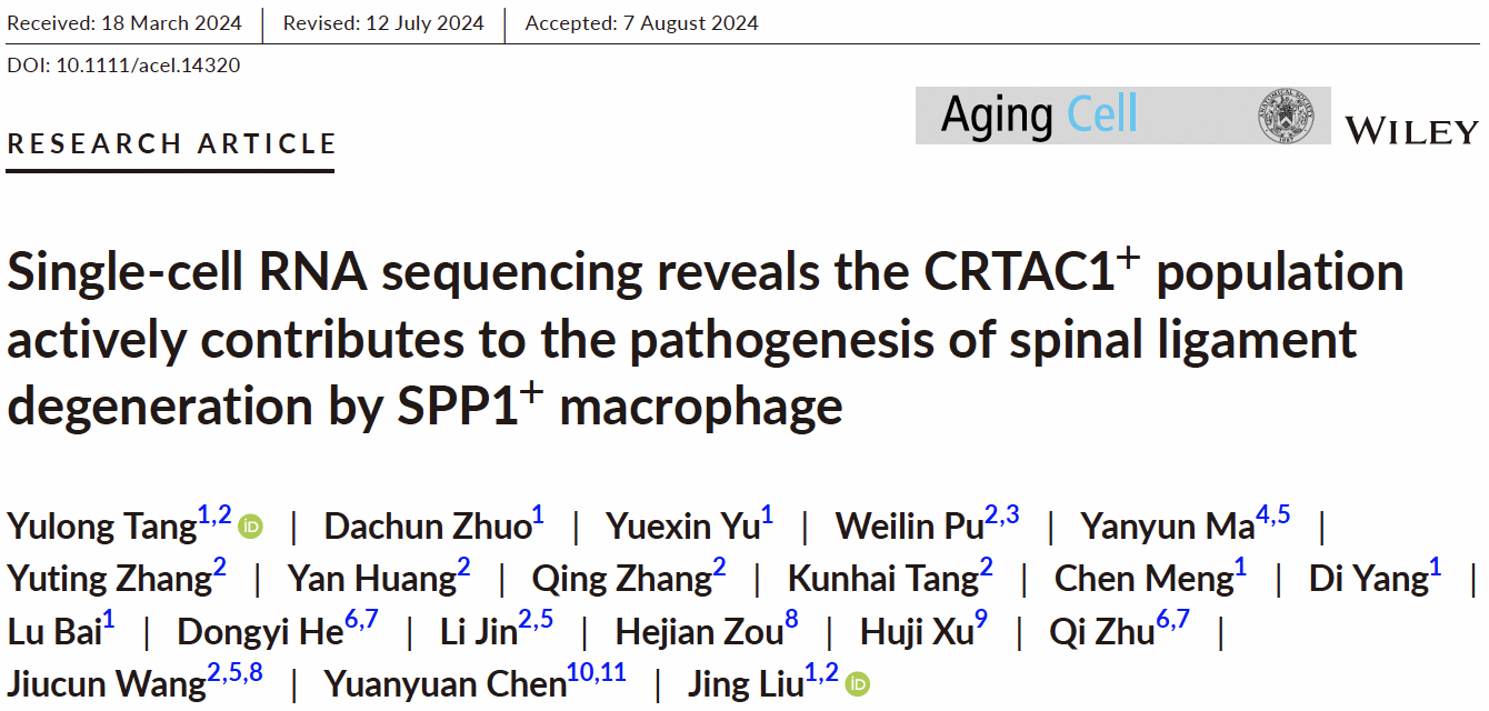 近日,复旦大学生命科学学院王久存教授、复旦大学人类表型组研究院刘晶青年副研究员与上海市第六人民医院、光华医院团队合作,在Aging cell期刊上发表了题为“Single-cell RNA sequencing reveals the CRTAC1+ population actively contributes to the pathogenesis of spinal ligament degeneration by SPP1+ macrophage”的研究论文。研究团队借助单细胞转录组学技术,深入探索了脊柱韧带退变的分子机制,为开发新的治疗方法提供了可能。