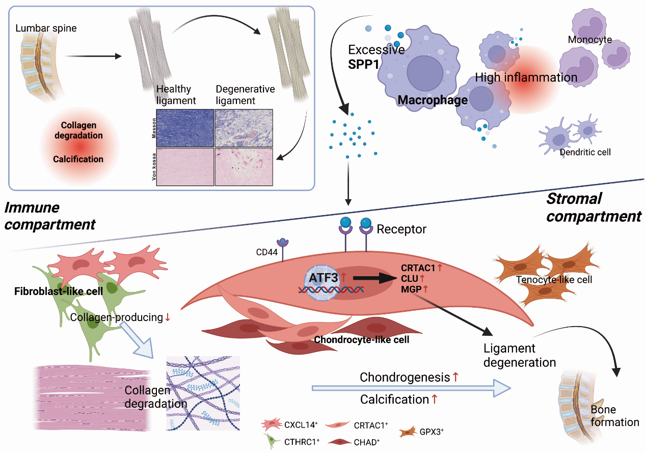 该团队通过对退变韧带中基质类细胞和免疫细胞的基因表达进行深入分析,揭示了致病的关键细胞类型和分子信号通路。研究人员发现,在脊柱狭窄的样本中,韧带附着点的胶原蛋白降解和矿物质沉积显著高于非狭窄外伤样本。通过单细胞测序技术,团队进一步确定了CTHRC1+型成纤维样细胞和CRTAC1+型软骨样细胞,分别为导致胶原蛋白降解和钙化的关键细胞类型。进一步研究发现,髓系免疫细胞在骨化韧带中异常活化,可通过分泌SPP1与基质细胞的CD44表面蛋白结合,进而激活转录因子ATF3,发挥其转录活性。在ATF3作用下,CRTAC1+型软骨样细胞在骨化处大量形成,进而激活MGP等骨化分子表达。