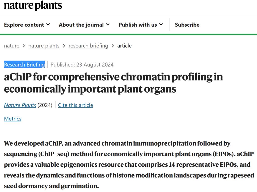 Nature plants同期配发了题为“aChIP for comprehensive chromatin profiling in economically important plant organs”的研究简报。期刊编辑对此项研究给予了高度评价,指出“由于植物细胞壁和多种代谢产物的复杂性,许多具有重要经济价值的植物器官的ChIP-seq实验难以成功。这项研究的亮点在于开发了一种创新的aChIP技术,成功解决这些问题,绘制了多个物种和器官的组蛋白修饰和转录因子结合位点图谱,为植物重要经济器官(如油菜干种子)提供了高质量的ChIP-seq数据”。
