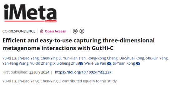 2. Yuxi Lu#, Jinbao Yang#, Chenying Li#, Yunhan Tian, Rongrong Chang, Dashuai Kong, Shulin Yang, Yanfang Wang, Yubo Zhang, Xiusheng Zhu*, Weihua Pan*, Siyuan Kong*. Efficient and easy-to-use capturing 3D metagenome interactions with GutHi-C. iMeta, 2024, e227. https://doi.org/10.1002/imt2.227.