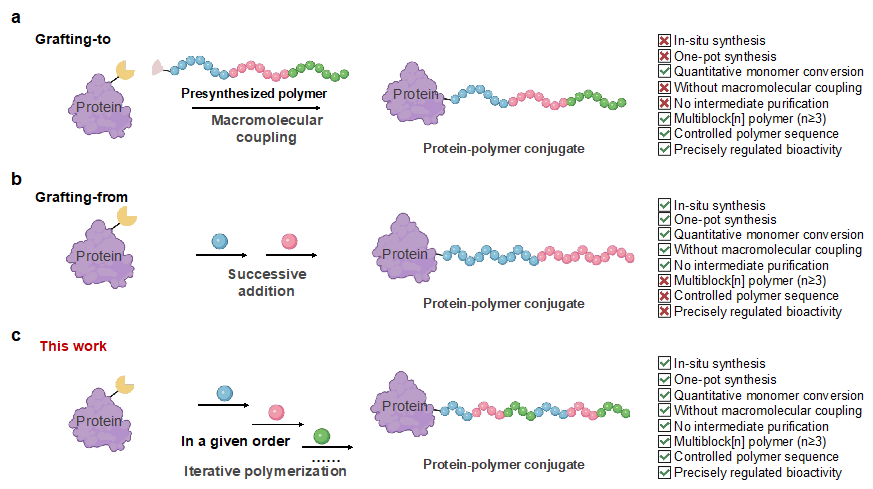 核酸、蛋白质等生物大分子,精准的序列结构对于其最终的功能表达起到了至关重要的作用。蛋白质作为基因功能的执行体,蛋白-蛋白相互作用是机体生命活动的基础。目前,蛋白药物被广泛应用于治疗或缓解各类疾病,其展现出了极大的商业价值和应用潜力。由于蛋白质自身生物稳定性差且体内半衰期短,因此通过制备蛋白质-聚合物偶联物是一种解决蛋白质成药性的有效措施。众所周知,蛋白质-聚合物偶联物中聚合物的序列结构显著影响了蛋白药物的生物功能与临床疗效,然而传统蛋白质-聚合物偶联物无法实现对高分子序列结构的精准控制,进而其生物功能与临床疗效受到了极大限制。因此,亟待开发一种可控合成策略用以精准调控蛋白药物偶联物中聚合物的序列结构,这是该领域面临的前沿科学问题。