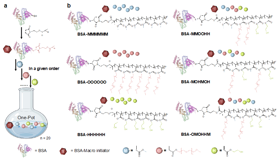 这种合成方法的优势在于,无需任何中间纯化,即可一锅法原位合成序列可控的多嵌段聚合物蛋白偶联物。作者选用了三种高反应性丙烯酸酯基单体,从而实现对单体序列的精确控制,包括疏水单体甲基丙烯酸酯(MA,M')、亲水单体低聚(乙二醇)丙烯酸酯(OEGA,O')和含有功能团 2-羟乙基丙烯酸酯(HEA,H')的单体,通过一锅迭代ATRP的聚合方法,以BSA-Macro作为大分子引发剂,按预定顺序依次聚合,每个循环的单体转化率定量(>99%)(图2a),得到六种具有精准序列控制的BSA-多嵌段聚合物偶联物:BSA-MMMMMM、BSA-OOOOOO, BSA-HHHHHH、BSA-MMOOHH、BSA-MOHMOH 和BSA-OMOHHM(图2b)。