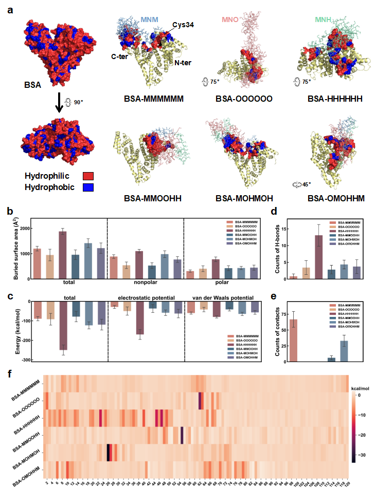 随后,作者对六种具有精准序列的BSA-多嵌段聚合物偶联物进行了全原子动力学模拟,这些BSA-多嵌段聚合物偶联物的单体序列显著影响了蛋白质/聚合物相互作用模式。在六种蛋白偶联物中,BSA-HHHHHH具有最大的包覆面积(~1900 Å2)和最低的相互作用能(约-250 kcal/mol)(图3b-c)。进一步,氢键分析证实BSA-HHHHHH与BSA间具有最多的氢键作用(图3d)。对于BSA-MMMMMM和BSA-OOOOOO来说,虽然具有类似的包覆面积与相互作用能,亲水性多嵌段聚合物与BSA之间具有更多的氢键作用(图3d)。结果表明,精确改变或控制聚合物的单体序列可以进一步精确调节蛋白质/聚合物相互作用。作者进一步研究了具有精确的多嵌段聚合物链上每个单体单元的能量贡献,发现这六种偶联物显示出不同的相互作用模式和不同的热点结合位点(图3f)。热点图在原子水平上表明,BSA和多嵌段聚合物中的特定结合位点能够高效调节蛋白质-多嵌段聚合物偶联物的物理化学性质和生物活性。