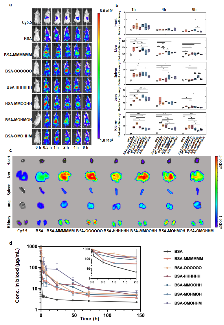 同时,研究者利用QOILP开发了葡萄糖氧化酶(GOx)-聚合物偶联物、以及β-半乳糖苷酶(β-gala)-聚合物偶联物,从而进一步验证了QOILP合成策略的高效性和普适性。为了研究序列可控蛋白-多嵌段聚合物偶联物的细胞摄取行为、体内生物分布、药代动力学等,首先采用MTT分析法证明了BSA 和BSA-多嵌段聚合物偶联物具有良好的生物相容性(图4b)。并利用流式细胞术和共聚焦激光扫描显微镜研究了具有不同序列的BSA-多嵌段聚合物偶联物的序列依赖性细胞摄取行为(图4a、4c-e)。结果表明,具有精确序列控制的多嵌段聚合物极大地促进了L929细胞对所得偶联物的细胞摄取。作者进一步评估单体序列对各种序列控制的 BSA-多嵌段聚合物偶联物体内生物分布的影响,对于BALB/c小鼠静脉注射Cy5.5标记的BSA和Cy5.5标记的BSA-多嵌段聚合物偶联物后,在特定时间点监测BALB/c小鼠的NIR荧光图像(图5a)。并通过分析器官的荧光,进一步研究了BSA和BSA-多嵌段聚合物偶联物的体内生物分布(图5b-c),结果表明多嵌段聚合物的单体序列可以精准调节蛋白质/聚合物相互作用,从而进一步优化其在体内的生物分布。随后,通过给SD大鼠静脉注射BSA和BSA-多嵌段聚合物偶联物,分析了BSA-多嵌段聚合物缀合物在体内的药代动力学(图5d),结果表明,通过对蛋白-多嵌段聚合物偶联物的序列调控,可以显著延长蛋白偶联物在体内的循环时间。
