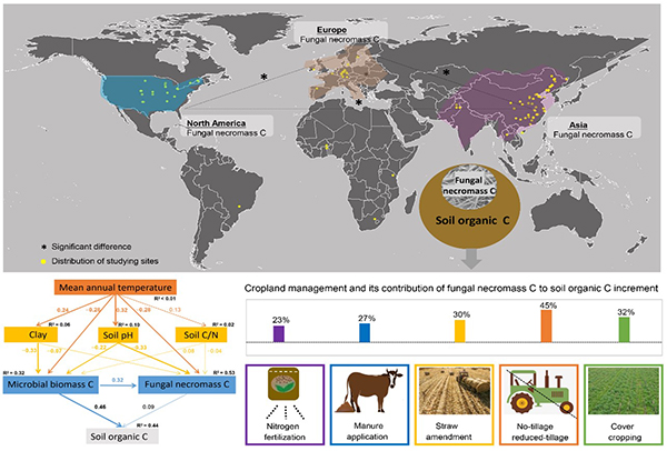 最新成果以Fungal necromass contribution to carbon sequestration in global croplands: a meta-analysis of driving factors and conservation practices为题,发表在环境科学国际期刊Science of the Total Environment上。刘栋副研究员为论文第一作者、于富强正高级工程师为论文通讯作者,合作者包括美国密歇根州立大学Gregory Bonito副教授、英国班戈大学Davey L. Jones教授、墨西哥研究生院Jesus Perez-Moreno院士、西北农林科技大学安韶山研究员、中国科学院昆明植物研究所Shahid Iqbal博士。