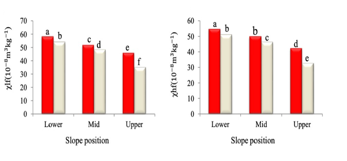 图1?土壤低频磁化率(lf)和高频磁化率(hf)变化