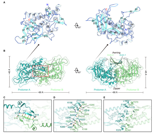 研究团队以呼肠孤病毒目质型多角体病毒(CPV)为研究对象,首先通过间接免疫荧光实验和蛋白质共表达发现NSP9与viroplasm潜在骨架NSP8存在一定的相互作用,表明NSP9在viroplasm中扮演重要角色。NSP9的C末端为潜在的内在高度无序区域(IDR),这一特征使NSP9在纯化过程中表现出显著的不均一性和较大程度的聚集倾向。通过制备均一、稳定的NSP9核心(NSP9ΔC)样品,研究团队获得了高质量的蛋白质晶体,利用X射线晶体衍射技术,成功解析了1.8 ? 的NSP9ΔC同源二聚体晶体结构。NSP9ΔC二聚体呈现独特的“乌篷船”(Awning-ship)形态,且具有高度的对称性。Alphafold3等结构预测未能准确呈现其复杂的局部特征,尤其是其稳定的二聚体界面。基于序列和三维结构的比对没有发现数据库中具有显著结构相似性的蛋白质,但研究团队发现一种感染植物的呼肠孤病毒(MRCV)的非结构蛋白P9-1与NSP9具有相似的拓扑结构特征。此外,尽管两者在整体三维结构上并未展现出显著的相似性,但核心区域的三束α螺旋表现出极高的结构相似度。这一发现提示在呼肠孤病毒目的非结构蛋白中,可能存在一类拓扑结构上高度保守的折叠形式,有可能使它们执行尚未完全了解的共同功能。
