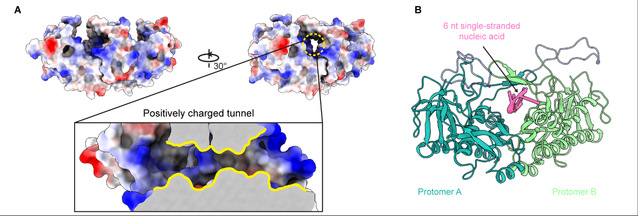 同时,结构信息也可以提供给我们一种合理的蛋白核酸结合模型猜想:由于正电荷氨基酸孔道结构的存在使得NSP9可以潜在的从单链核酸的两端“串入”,从而表现为生化实验观察到的在结合单链核酸时蛋白浓度依赖性的依次出现不同形式的蛋白-核酸复合物的能力。