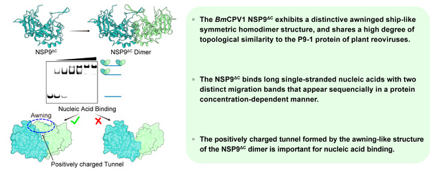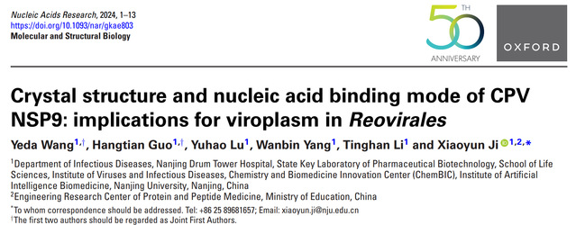 2024 年 9 月 17 日,南京大学生命科学学院籍晓云团队在国际权威期刊《核酸研究》( Nucleic Acids Research )上发表题为 “Crystal s tructure and n ucleic a cid b inding m ode of CPV NSP9: i mplications for v iroplasm in Reovirales ” 的最新研究成果