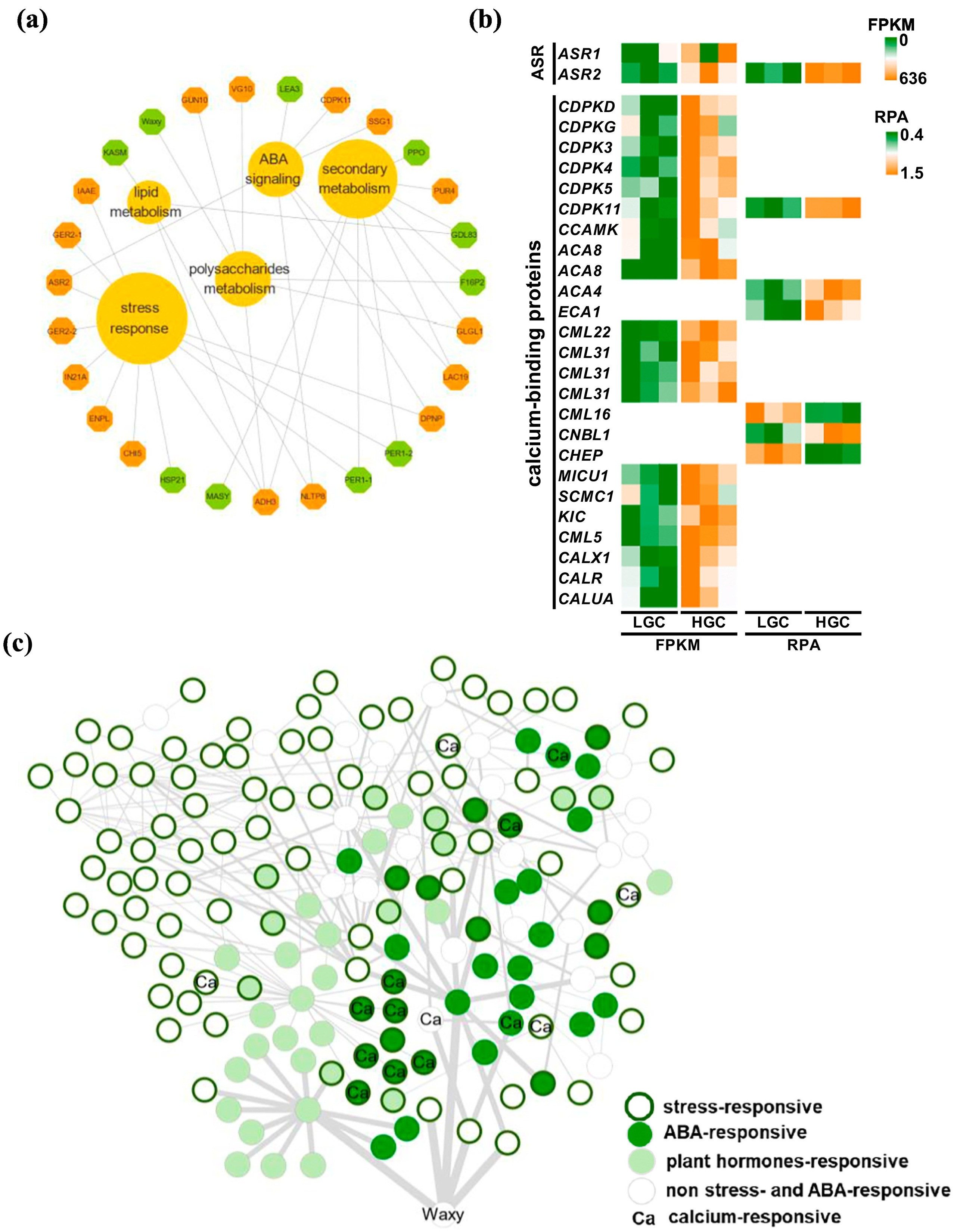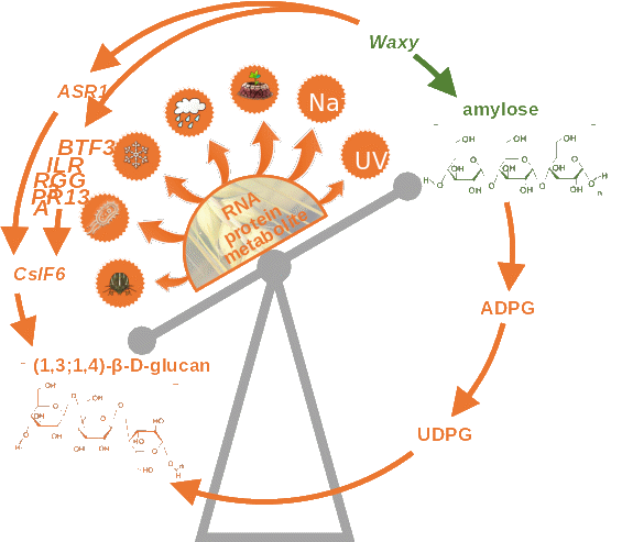 近日,中国科学院成都生物研究所麦类作物分子育种与应用创新团队在大麦β-葡聚糖含量差异机制解析中取得突破。研究人员发现大麦直链淀粉与β-葡聚糖含量显著负相关,基于直链淀粉合成的关键基因--Waxy基因的突变型大麦材料,构建了高、低β-葡聚糖含量大麦混池,联合转录组、蛋白组和代谢组分析,发现Waxy基因功能缺失突变体β-葡聚糖含量升高与胁迫响应,尤其是与脱落酸(ABA)信号响应增强有关。结合酵母杂交、BiFC等方法,鉴定到四个与β-葡聚糖合成重要基因CsLF6的转录因子ILR3、BTF3、RGGA和PR13,这些基因均参与胁迫响应,并在高β-葡聚糖含量大麦中保持较高的表达水平。进一步通过基因功能研究,发现脱落酸胁迫诱导蛋白基因(ABA stress ripening induced protein 1,ASR1)可正向调控β-葡聚糖合成,当ASR1表达上调时,CsLF6的表达水平及β-葡聚糖合成底物UDPG的浓度随之升高。该研究为β-葡聚糖含量差异机制的解析展现了新的视角,为进一步发掘β-葡聚糖含量差异的关键基因提供了重要基础。