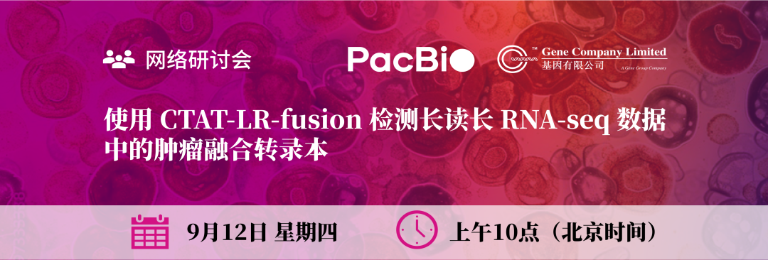 北京时间9月12日星期四上午10点,PacBio公司将举办主题为“使用 CTAT-LR-fusion 检测长读长 RNA-seq 数据中的肿瘤融合转录本”的网络研讨会,基因有限公司诚邀您参加本次研讨会。