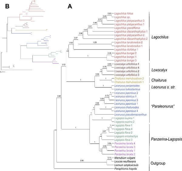益母草族隶属于唇形科野芝麻亚科,共包括传统界定的益母草属Leonurus?L.、鬃尾草属Chaiturus?Willd.、夏至草属Lagopsis?(Bunge ex?Benth.) Bunge、兔唇花属Lagochilus?Bunge ex Benth.、斜萼草属Loxocalyx?Hemsl.和脓疮草属Panzerina?Soják六个属。已有的分子系统学研究尽管只包括了该族少量的代表物种和有限的DNA分子序列,却表明其中的一些属可能不是单系。为解决这些问题,昆明植物所向春雷研究团队与国内外学者合作,基于全面的取样,开展了益母草族的系统发育基因组学研究。基于叶绿体全基因组序列和127个核基因序列构建的系统发育框架均表明益母草族可划分为六个稳定的分支,传统界定的益母草属分为两个分支,即“Leonurus”clade和“Paraleonurus”clade,且后一分支还包括了夏至草Lagopsis supina?(Stephan ex Willd.) Ikonn.-Gal.(图1),这一系统发育关系也得到了形态学特征和地理分布的支持。