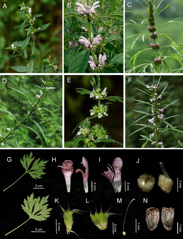 图2.?新属益母草属的形态特征。A:錾菜P. pseudomacranthus;B:大花益母草P. macranthus;C:细叶益母草P. sibiricus;D:假鬃尾草P. chaituroides;E:夏至草P. supinus;?F:益母草P.japonicus;G-L:细叶益母草的叶片,花冠,花冠解剖图,子房,花萼,花萼解剖图;?M-N:益母草的雌蕊和小坚果