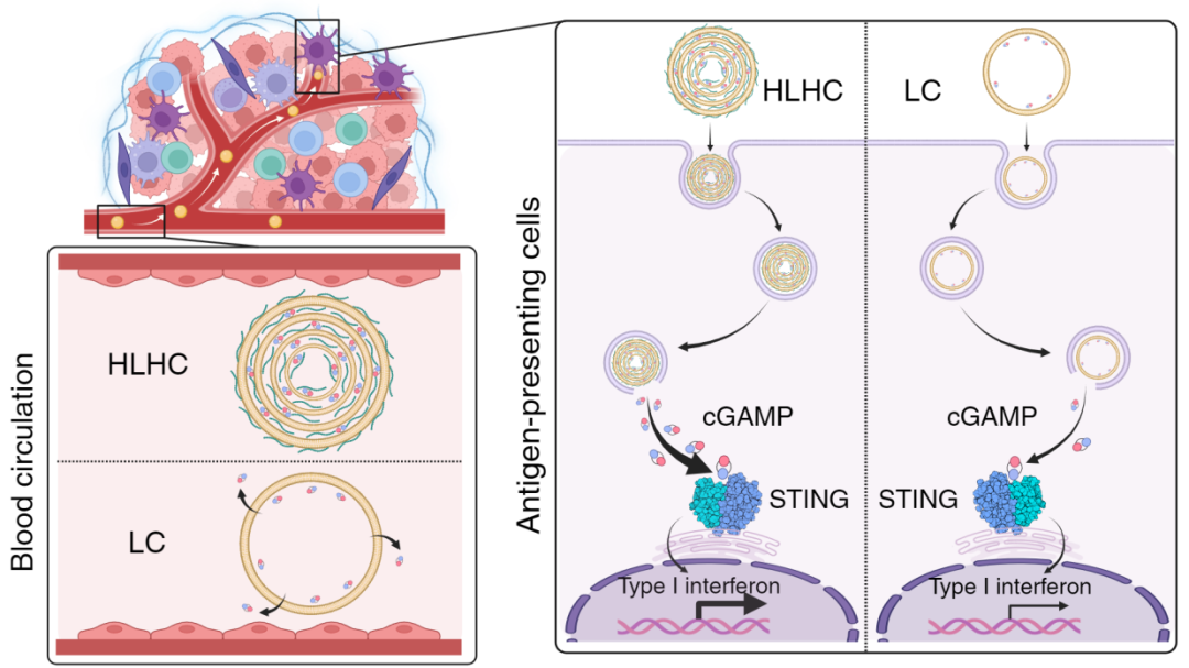 通过系统给药激活肿瘤组织内抗原呈递细胞(APCs)的STING通路可促进I型干扰素产生,进而提高抗肿瘤免疫应答,是一种极具潜力的肿瘤治疗策略。然而,大多数STING激动剂(如cGAMP)是带负电的亲水性小分子,在系统给药后易从体内快速清除。此外,这类分子透过生物膜的效率低,难以高效到达APCs细胞质激活STING通路。虽然科学家们开发了多种不同种类的脂质或聚合物纳米粒以提高药物向细胞质的递送效率,但这些纳米粒依然面临诸多挑战。例如在靶细胞内可实现高效细胞质递送的纳米粒在血液循环中容易过早释放药物,而在血液循环中稳定的纳米粒难以在靶细胞内实现高效的细胞质递送。如何兼顾纳米粒的稳定性和高效的细胞质递送依然是亟待解决的问题。