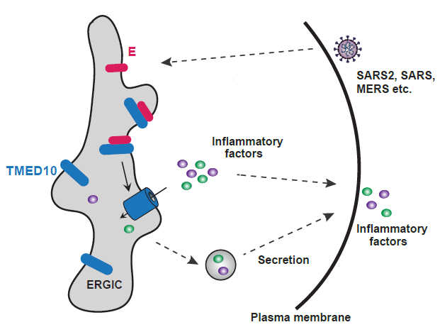 研究团队首先检测了一系列新冠病毒的膜蛋白对炎症因子分泌的影响,发现E蛋白强烈刺激宿主细胞炎症因子的释放,且相比于轻症冠状病毒,重症冠状病毒的E蛋白刺激炎症因子释放的程度显著更高,提示E蛋白是重症冠状病毒感染导致炎症风暴和重症的一个通用致病因子。随后通过对分子机制的深入研究,发现重症 E蛋白通过与TMED10蛋白强烈互作激活THU非经典分泌通路从而加剧炎症因子的释放(图1)。最后,研究人员筛选鉴定到一类孕酮类小分子药物,能够抑制E-TMED10相互作用,从而减弱炎症因子的分泌,减轻机体的炎症反应。这些发现阐明了重症冠状病毒诱导机体高炎症的分子机理,提出了E-TMED10相互作用可作为对抗冠状病毒诱导的炎症不良反应的潜在治疗靶点,为应对未来可能新发的冠状病毒疫情提供了思路。