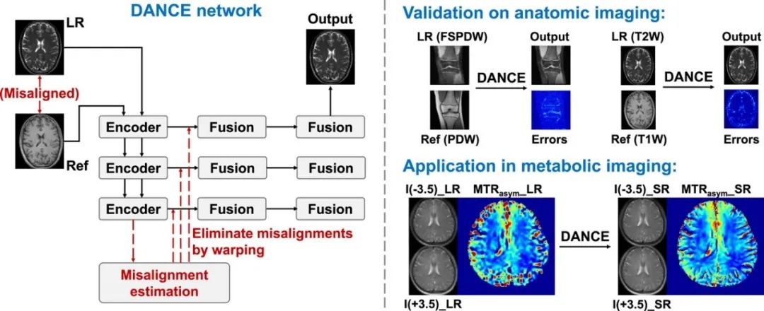 图1:DANCE网络结构(左)以及在不同对比结构像(右上)和APTW代谢磁共振像(右下)的超分辨重建效果示意